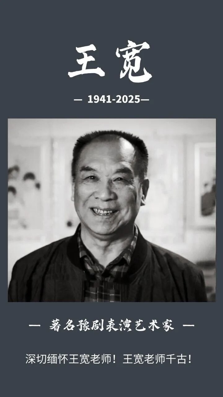 中国共产党党员、一级演员、著名豫剧表演艺术家、原郑州市豫剧团副团长王宽同志,因病医治无效,于2025年10月3日10时20分在郑州逝世,享年85岁。